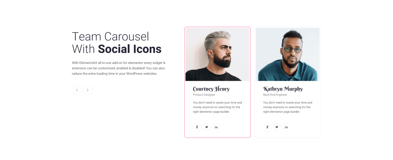 Team Carousel With Social Icons With ElementsKit all-in-one add-on for elementor every widget & extension can be customized, enabled & disabled! You can also reduce the extra loading time in your WordPress websites. Courtney Henry Product Designer You don’t need to waste your time and money anymore on searching for the right elementor page builder. […]
