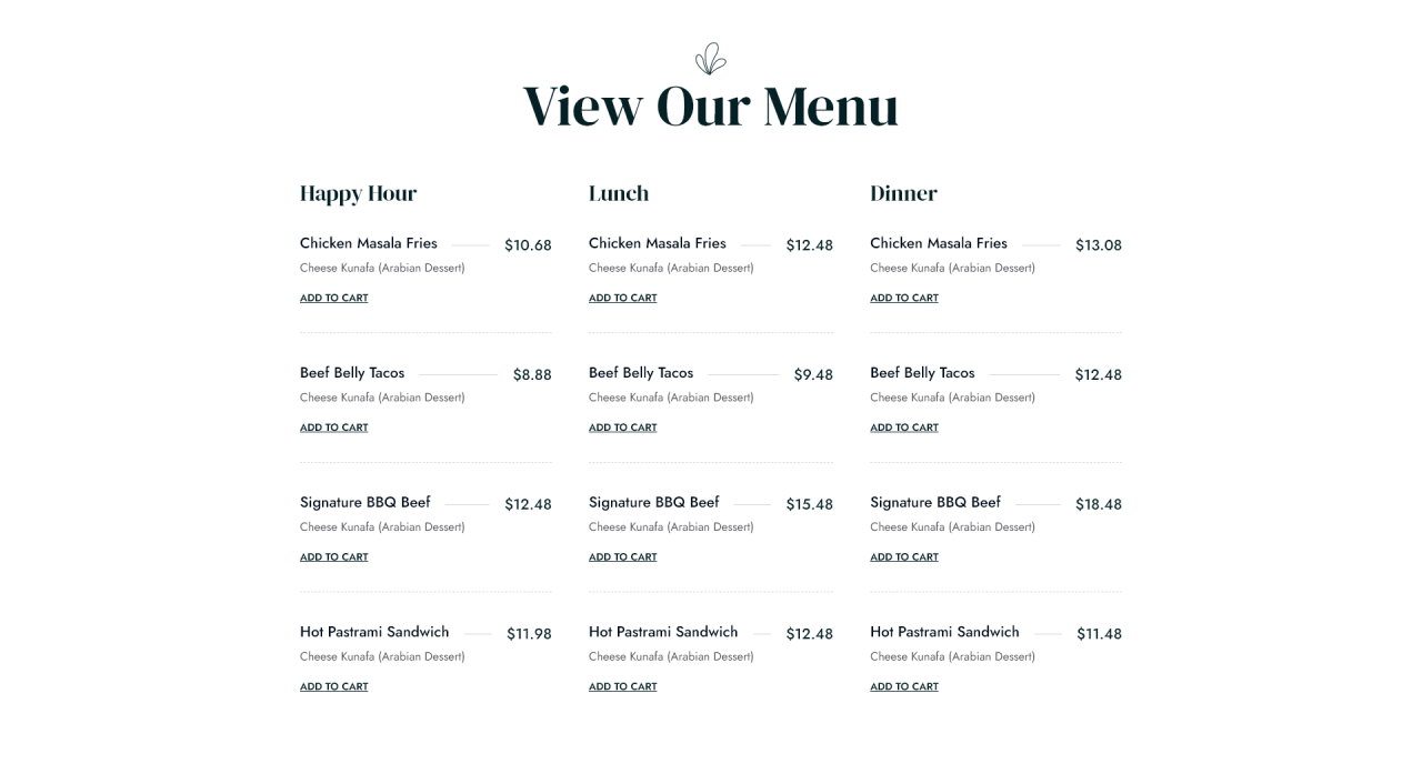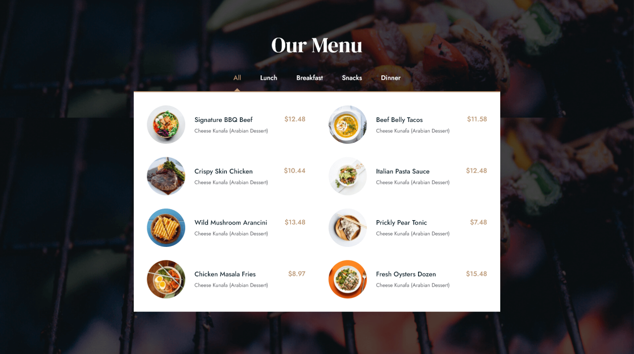 Our Menu All Lunch Breakfast Snacks Dinner Edit Content Signature BBQ Beef $12.48 Cheese Kunafa (Arabian Dessert) Crispy Skin Chicken $10.44 Cheese Kunafa (Arabian Dessert) Wild Mushroom Arancini $13.48 Cheese Kunafa (Arabian Dessert) Chicken Masala Fries $8.97 Cheese Kunafa (Arabian Dessert) Beef Belly Tacos $11.58 Cheese Kunafa (Arabian Dessert) Italian Pasta sauce $12.48 Cheese Kunafa […]