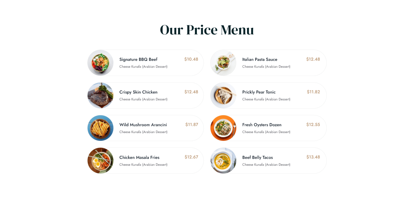 Our Price Menu Signature BBQ Beef $10.48 Cheese Kunafa (Arabian Dessert) Crispy Skin Chicken $12.48 Cheese Kunafa (Arabian Dessert) Wild Mushroom Arancini $11.87 Cheese Kunafa (Arabian Dessert) Chicken Masala Fries $12.67 Cheese Kunafa (Arabian Dessert) Italian Pasta sauce $12.48 Cheese Kunafa (Arabian Dessert) Prickly Pear Tonic $11.82 Cheese Kunafa (Arabian Dessert) Fresh Oysters Dozen $12.55 […]