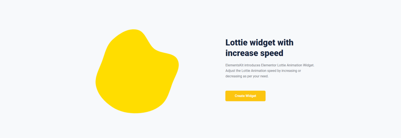 Lottie widget with increase speed ElementsKit introduces Elementor Lottie Animation Widget. Adjust the Lottie Animation speed by increasing or decreasing as per your need. Create Widget