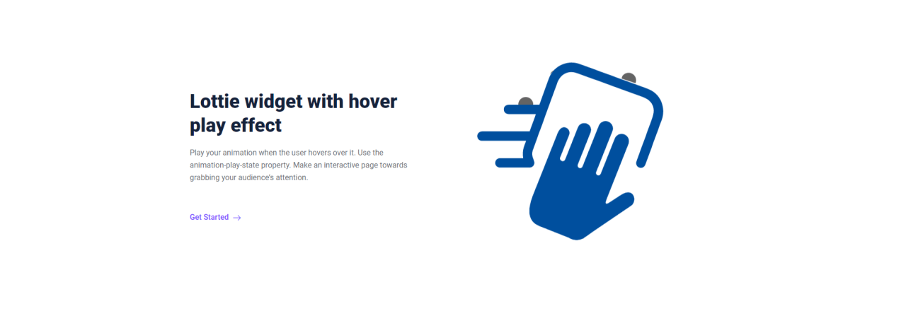 Lottie widget with hover play effect Play your animation when the user hovers over it. Use the animation-play-state property. Make an interactive page towards grabbing your audience’s attention. Get Started