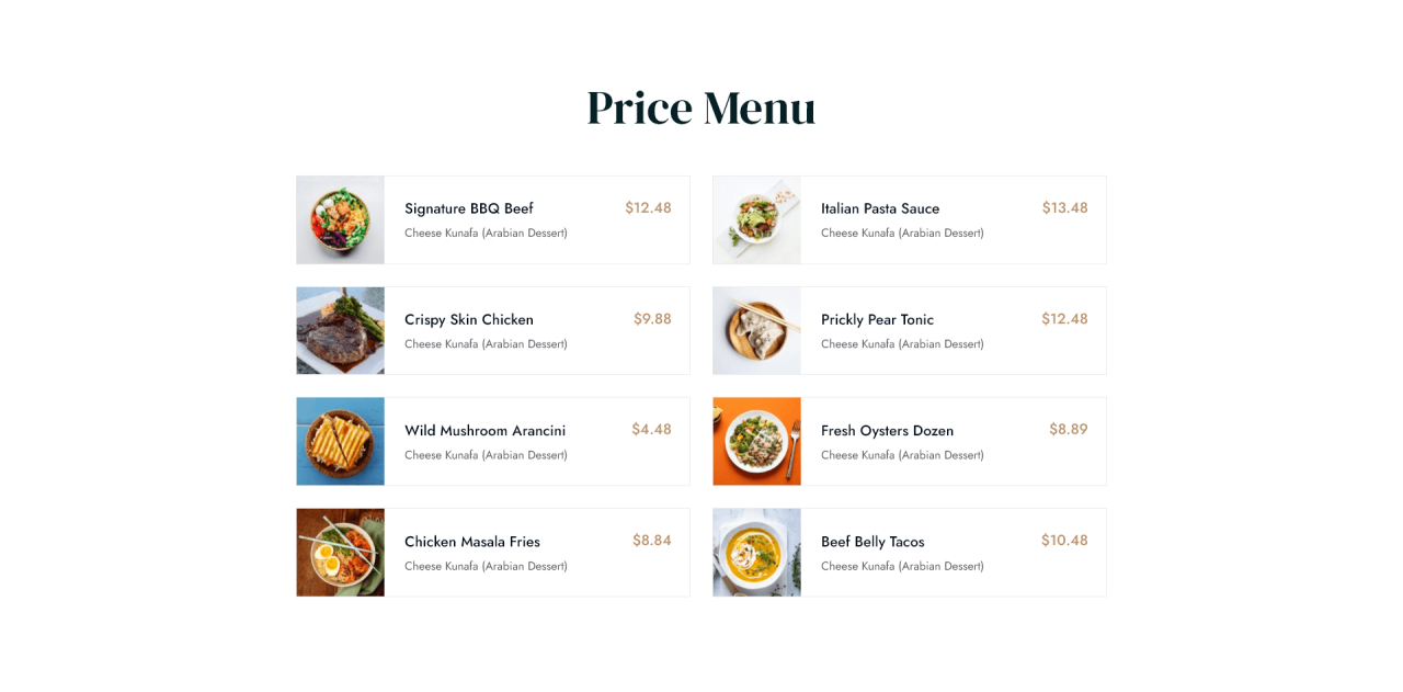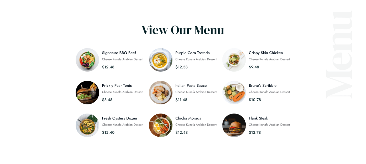 Price Menu Signature BBQ Beef $12.48 Cheese Kunafa (Arabian Dessert) Crispy Skin Chicken $9.88 Cheese Kunafa (Arabian Dessert) Wild Mushroom Arancini $4.48 Cheese Kunafa (Arabian Dessert) Chicken Masala Fries $8.84 Cheese Kunafa (Arabian Dessert) Italian Pasta sauce $13.48 Cheese Kunafa (Arabian Dessert) Prickly Pear Tonic $12.48 Cheese Kunafa (Arabian Dessert) Fresh Oysters Dozen $8.89 Cheese […]