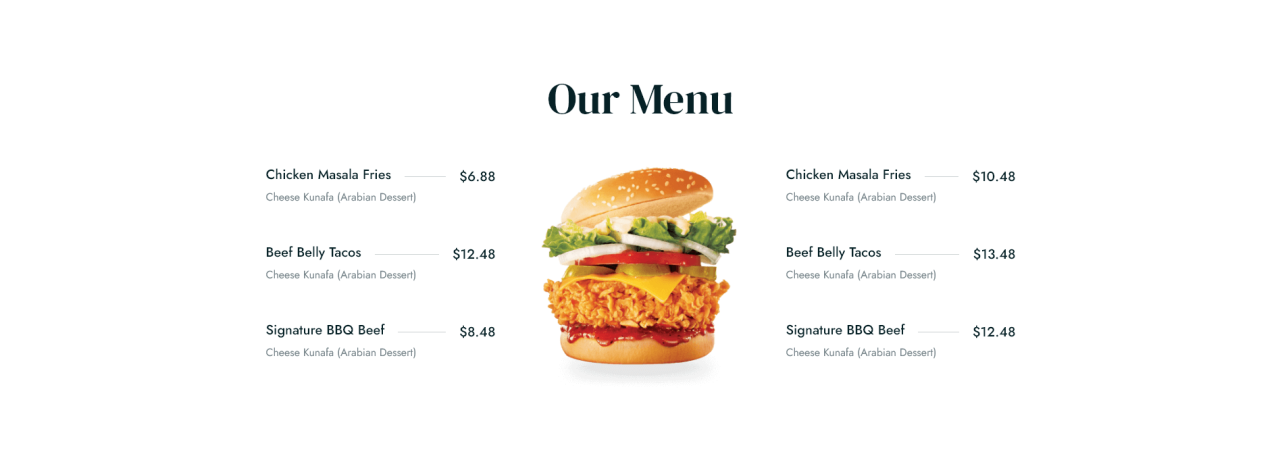 Our Menu Chicken Masala Fries $6.88 Cheese Kunafa (Arabian Dessert) Beef Belly Tacos $12.48 Cheese Kunafa (Arabian Dessert) Signature BBQ Beef $8.48 Cheese Kunafa (Arabian Dessert) Chicken Masala Fries $10.48 Cheese Kunafa (Arabian Dessert) Beef Belly Tacos $13.48 Cheese Kunafa (Arabian Dessert) Signature BBQ Beef $12.48 Cheese Kunafa (Arabian Dessert)