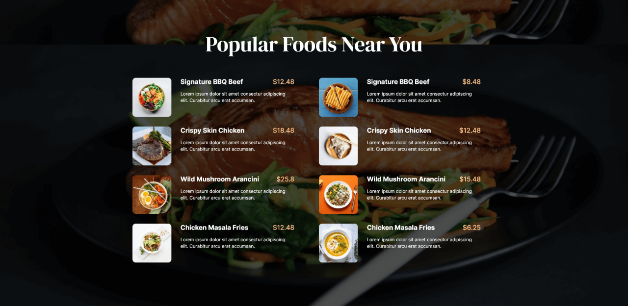 Popular Foods Near You Signature BBQ Beef $12.48 Lorem ipsum dolor sit amet consectur adipiscing elit. Curabitur arcu erat accumsan. Crispy Skin Chicken $18.48 Lorem ipsum dolor sit amet consectur adipiscing elit. Curabitur arcu erat accumsan. Wild Mushroom Arancini $25.8 Lorem ipsum dolor sit amet consectur adipiscing elit. Curabitur arcu erat accumsan. Chicken Masala Fries […]