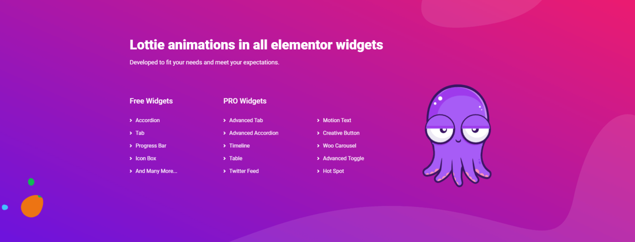 Animate Your Widgets with Lottie Integrate eye-soothing animations to all Elementor widgets. Free Widgets Accordion Tab Progress Bar Icon Box And Many More… PRO Widgets Advanced Tab Advanced Accordion Timeline Table Twitter Feed Motion Text Creative Button Woo Carousel Advanced Toggle Hot Spot