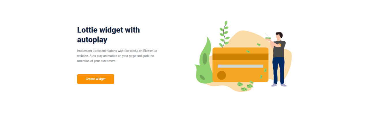 Lottie widget with autoplay Implement Lottie animations with few clicks on Elementor website. Auto play animation on your page and grab the attention of your customers. Create Widget