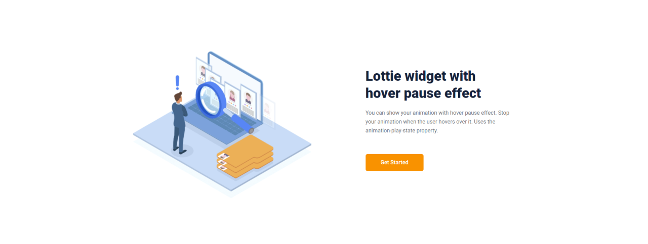 Lottie widget with hover pause effect You can show your animation with hover pause effect. Stop your animation when the user hovers over it. Uses the animation-play-state property. Get Started