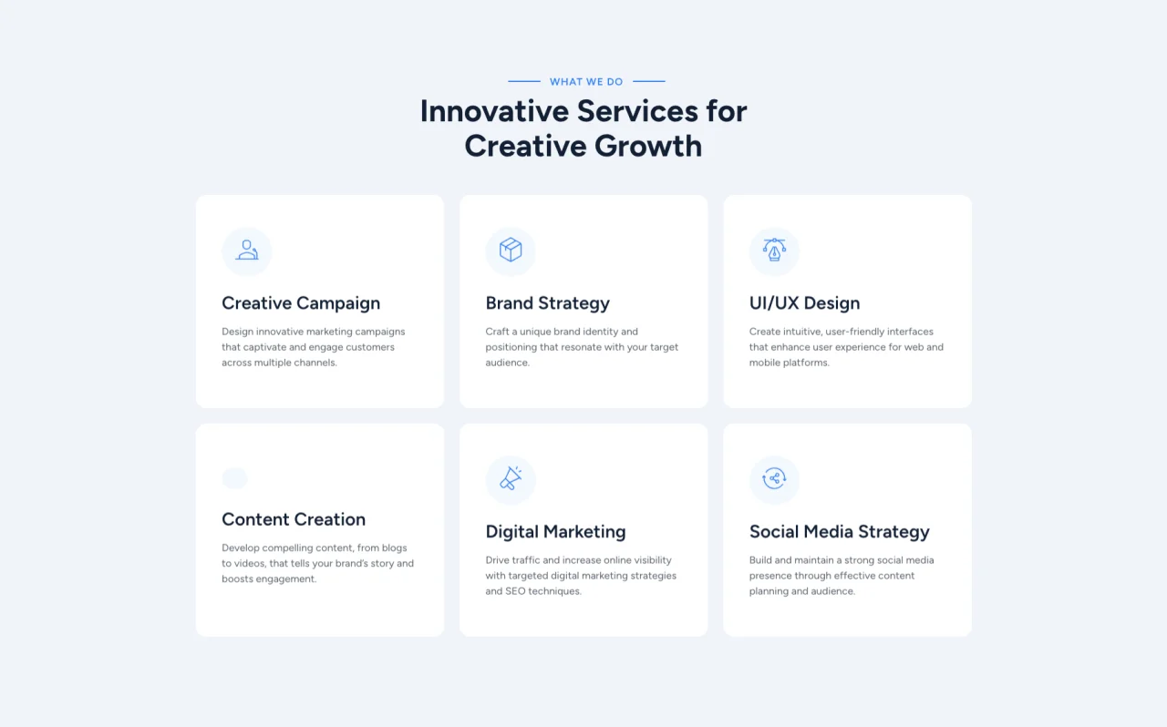 What We Do Innovative Services for Creative Growth Creative Campaign Design innovative marketing campaigns that captivate and engage customers across multiple channels. Creative Campaign Design innovative marketing campaigns that captivate and engage customers across multiple channels. View Details Brand Strategy Craft a unique brand identity and positioning that resonate with your target audience. Brand Strategy […]