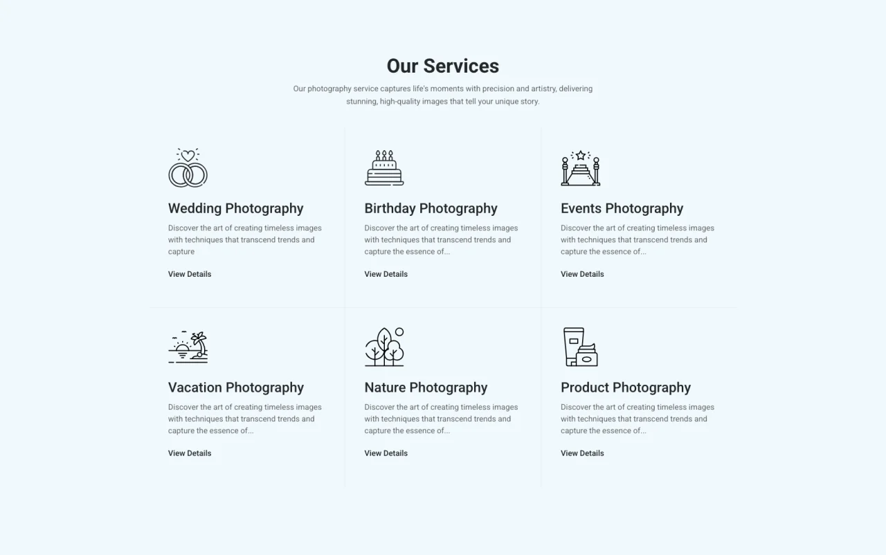 Our Services Our photography service captures life’s moments with precision and artistry, delivering stunning, high-quality images that tell your unique story. Wedding Photography Discover the art of creating timeless images with techniques that transcend trends and capture View Details Birthday Photography Discover the art of creating timeless images with techniques that transcend trends and capture […]