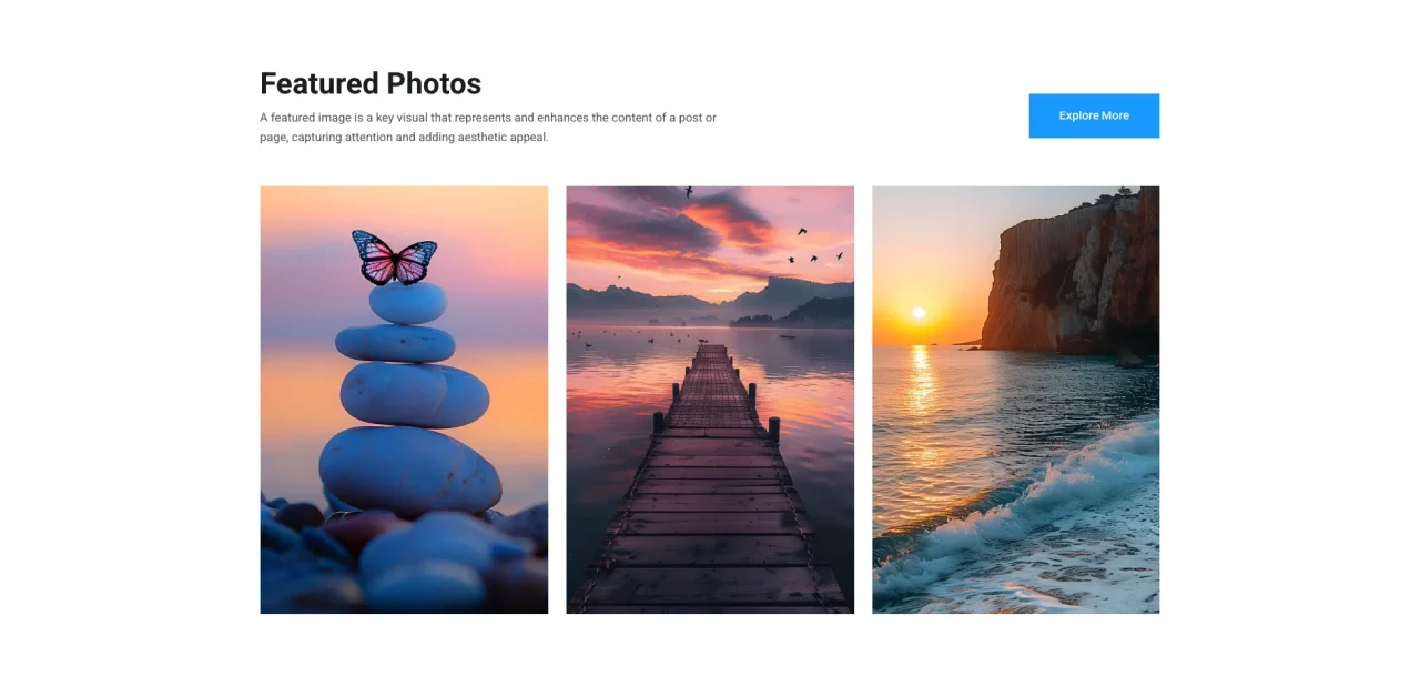 Featured Photos A featured image is a key visual that represents and enhances the content of a post or page, capturing attention and adding aesthetic appeal. Explore More 14 Photography Professional Skill Development View Details 14 Photography Professional Skill Development View Details 14 Photography Professional Skill Development View Details