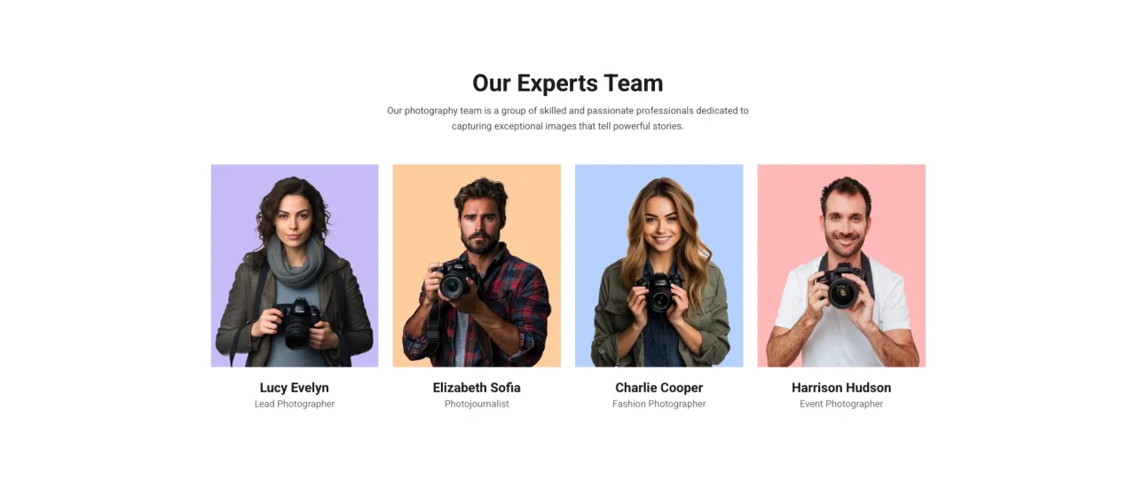 Our Experts Team Our photography team is a group of skilled and passionate professionals dedicated to capturing exceptional images that tell powerful stories. Lucy Evelyn Lead Photographer Elizabeth Sofia Photojournalist Charlie Cooper Fashion Photographer Harrison Hudson Event Photographer