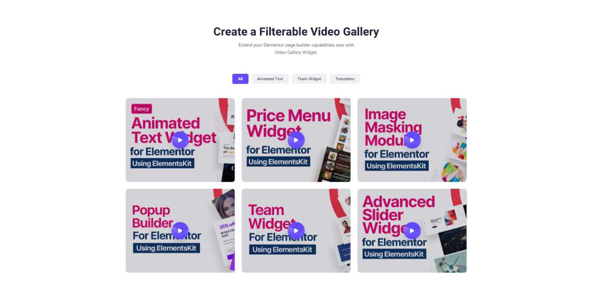 Create a Filterable Video Gallery Extend your Elementor page builder capabilities now with Video Gallery Widget. All Animated Text Team Widget Templates