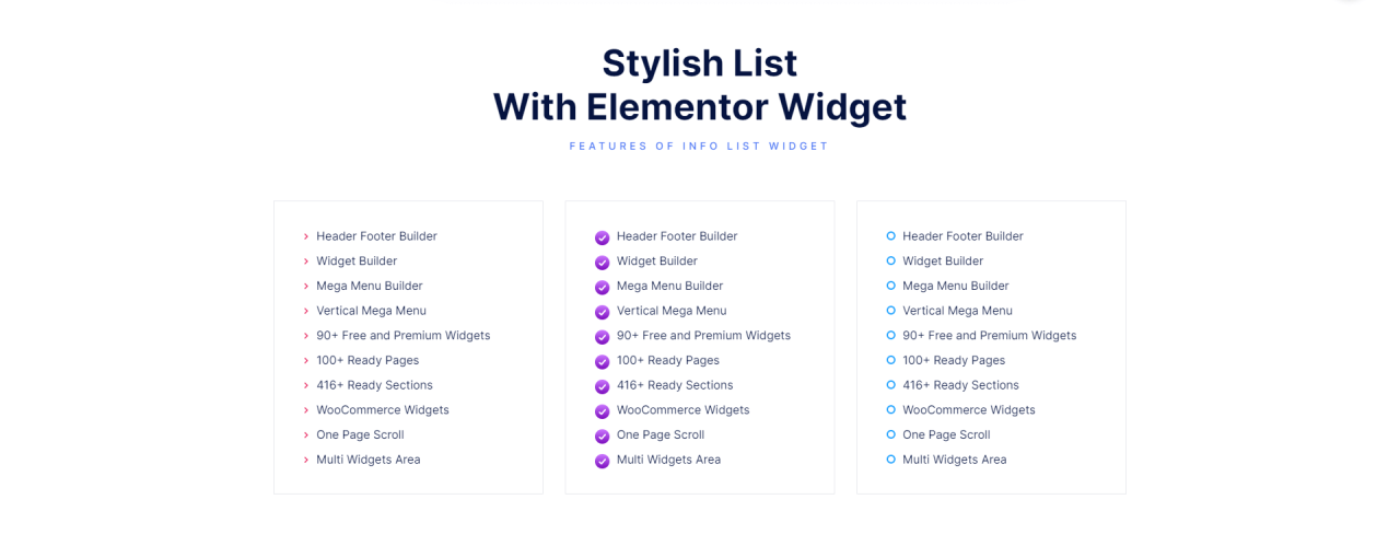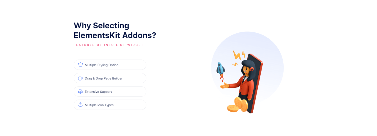 Why Selecting ElementsKit Addons? Features of Info List Widget Multiple Styling Option Drag & Drop Page Builder Extensive Support Multiple Icon Types