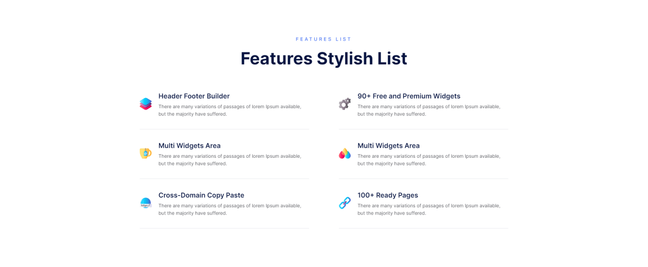 Features List Features Stylish List Header Footer Builder There are many variations of passages of lorem Ipsum available, but the majority have suffered. Multi Widgets Area There are many variations of passages of lorem Ipsum available, but the majority have suffered. Cross-Domain Copy Paste There are many variations of passages of lorem Ipsum available, but […]