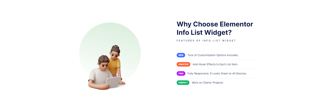 Why Choose Elementor Info List Widget? Features of Info List Widget Tons of Customization Options Included. New Add Hover Effects to Each List Item. Creative Fully Responsive. It Looks Great on All Devices. Free Work on Clients’ Projects Perfect