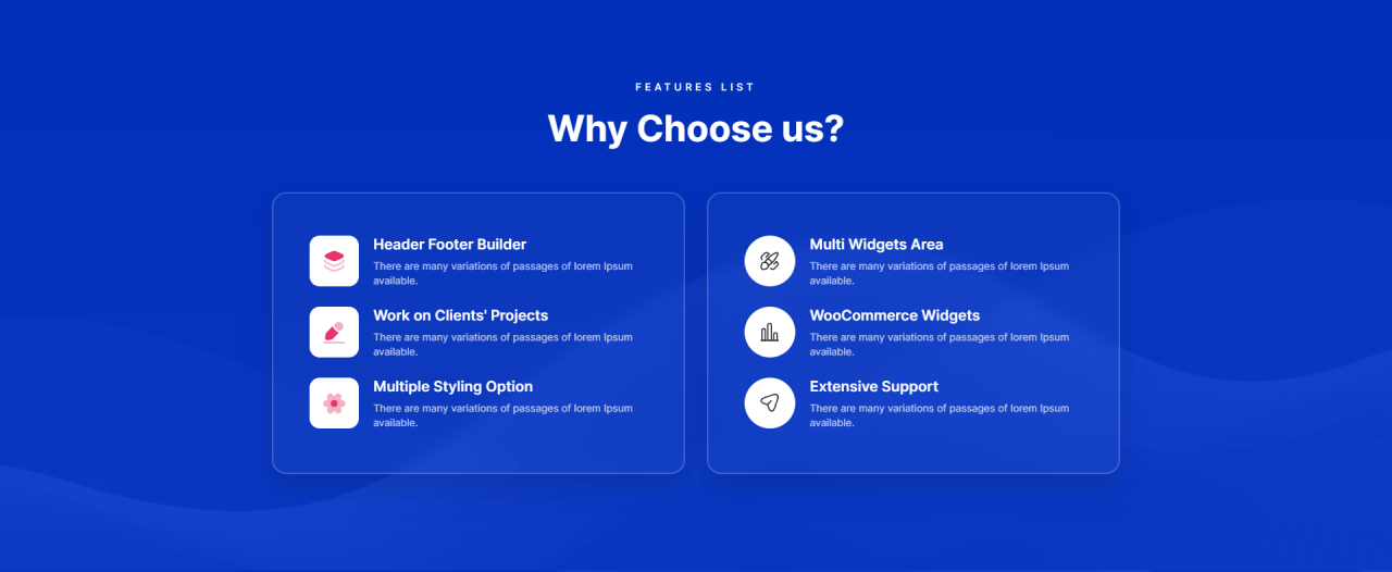 Features List Why Choose us? Header Footer Builder There are many variations of passages of lorem Ipsum available. Work on Clients’ Projects There are many variations of passages of lorem Ipsum available. Multiple Styling Option There are many variations of passages of lorem Ipsum available. Multi Widgets Area There are many variations of passages of […]