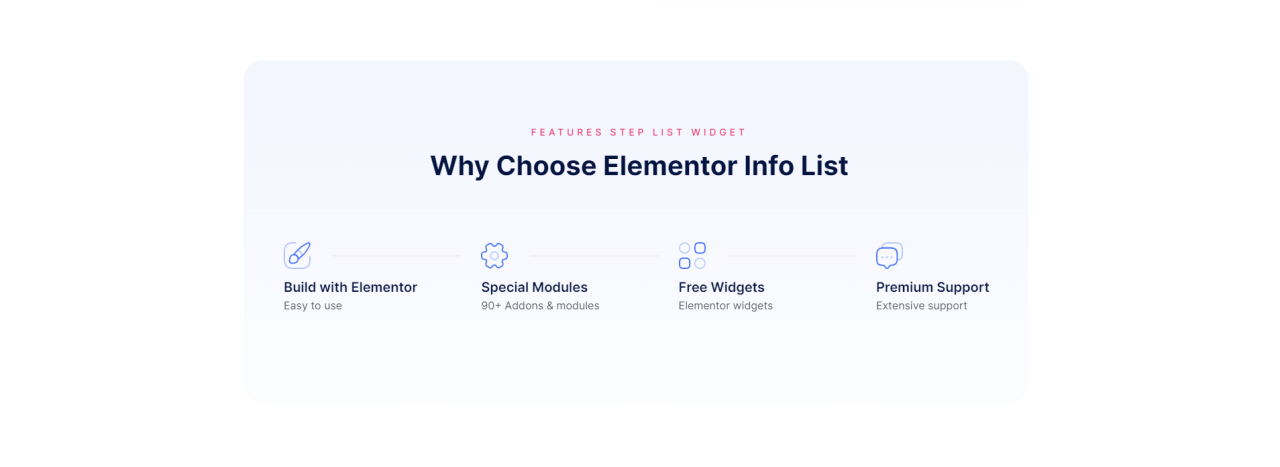 Features Step List Widget Why Choose ElementsKit Stylish List Build with Elementor Easy to use Special Modules 90+ Addons & modules Free Widgets Elementor widgets Premium Support Extensive support