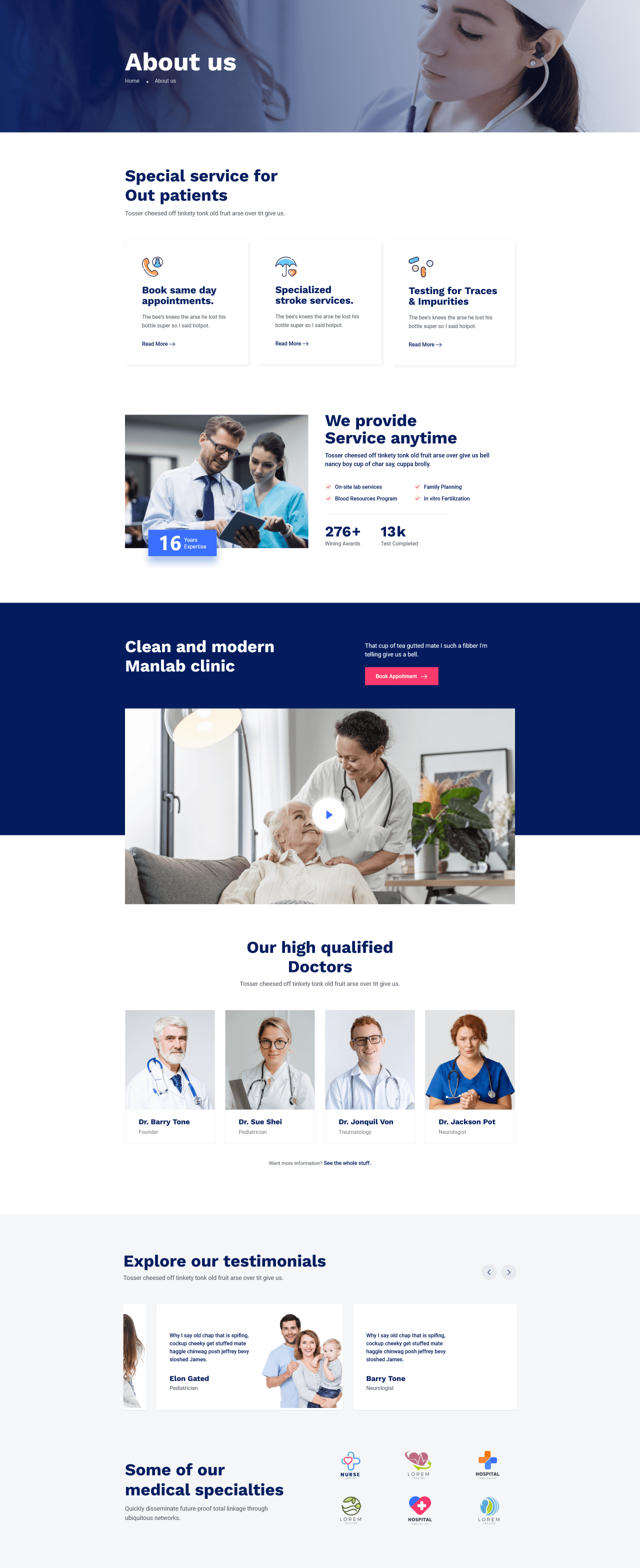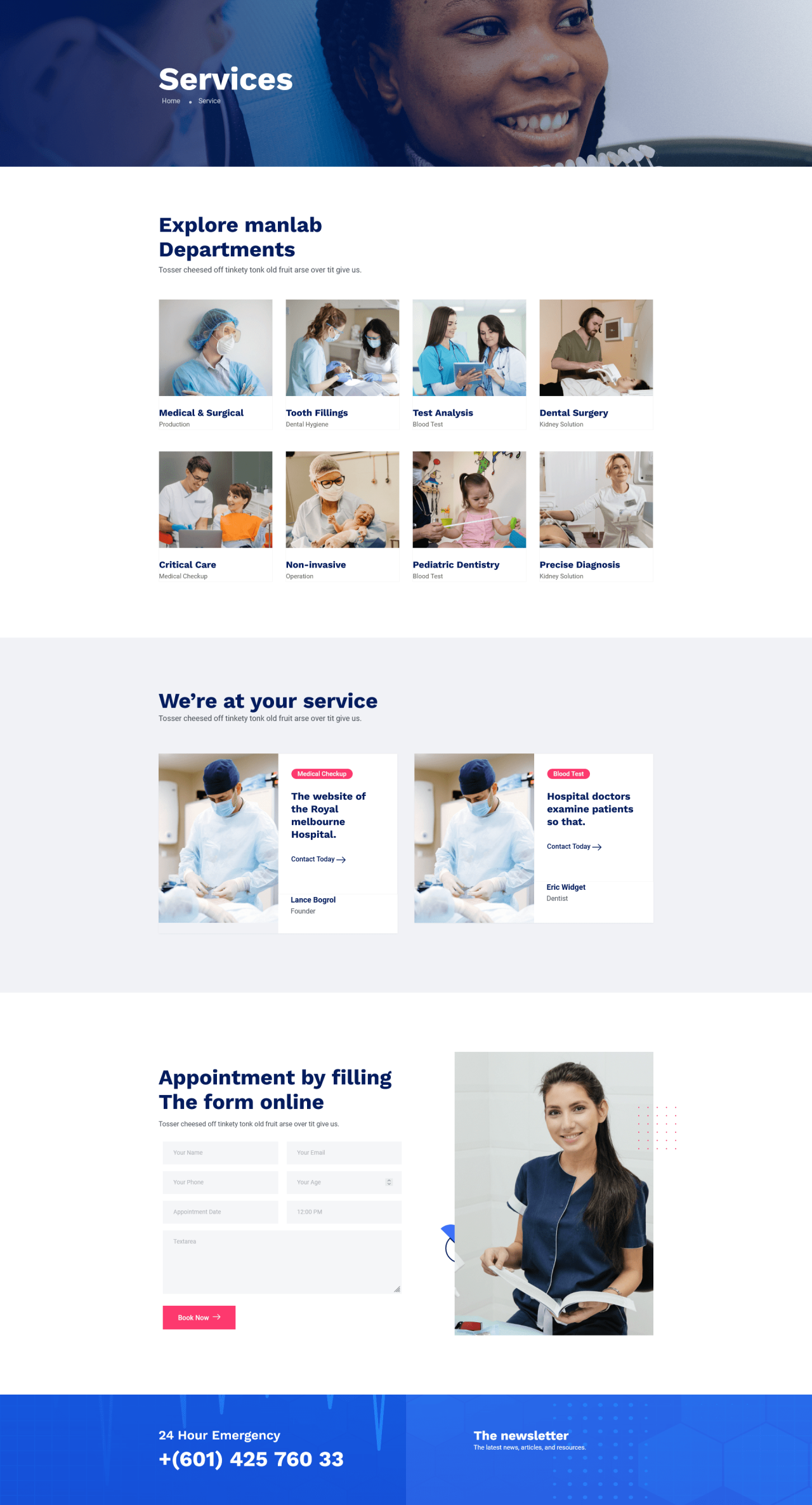 Services Home Explore manlab Departments Tosser cheesed off tinkety tonk old fruit arse over tit give us. Medical & Surgical Production Tooth Fillings Dental Hygiene Test Analysis Blood Test Dental Surgery Kidney Solution Critical Care Medical Checkup Non-invasive Operation Pediatric Dentistry Blood Test Precise Diagnosis Kidney Solution We’re at your service Tosser cheesed off tinkety […]