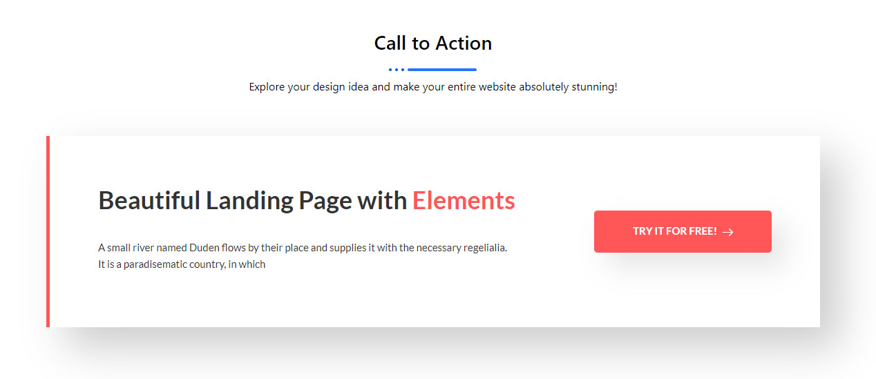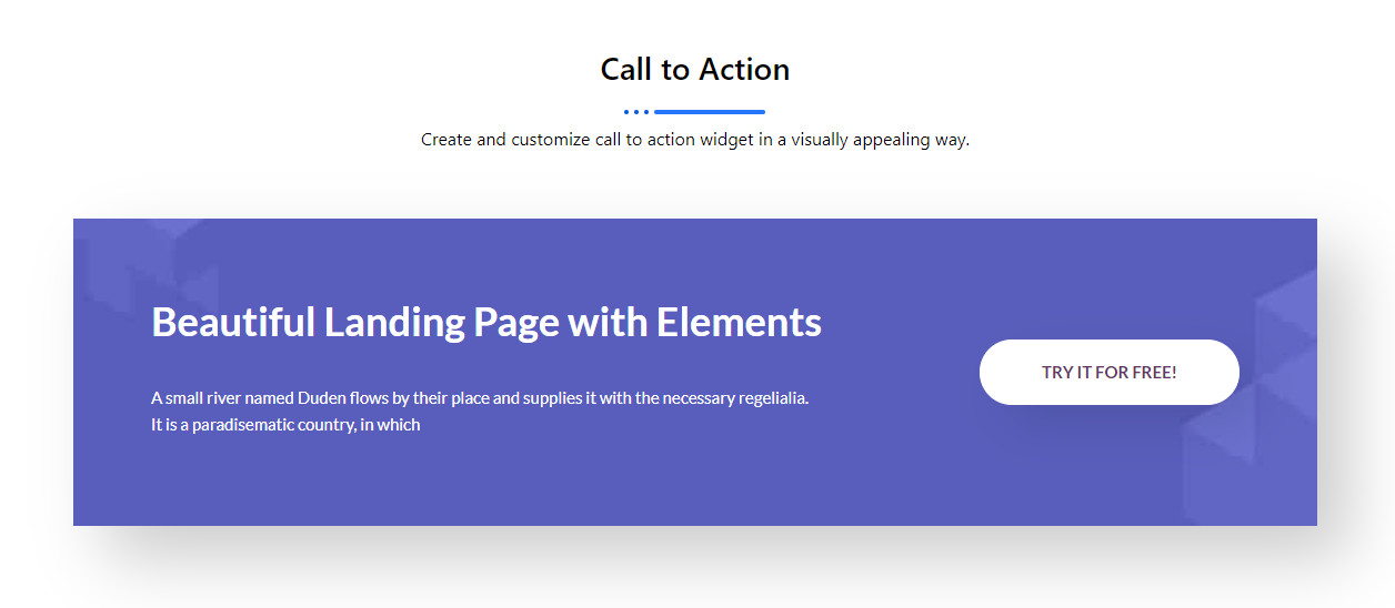 Call to Action Create and customize call to action widget in a visually appealing way. Beautiful Landing Page with Elements A small river named Duden flows by their place and supplies it with the necessary regelialia. It is a paradisematic country, in which Try it for Free!