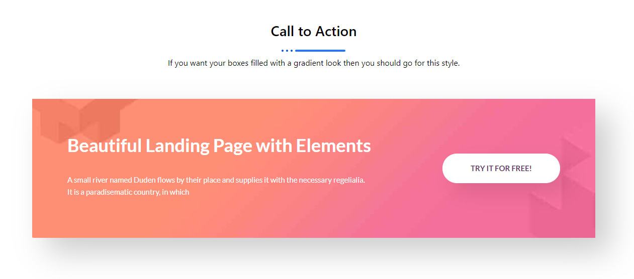Call to Action If you want your boxes filled with a gradient look then you should go for this style. Beautiful Landing Page with Elements A small river named Duden flows by their place and supplies it with the necessary regelialia. It is a paradisematic country, in which Try it for Free!
