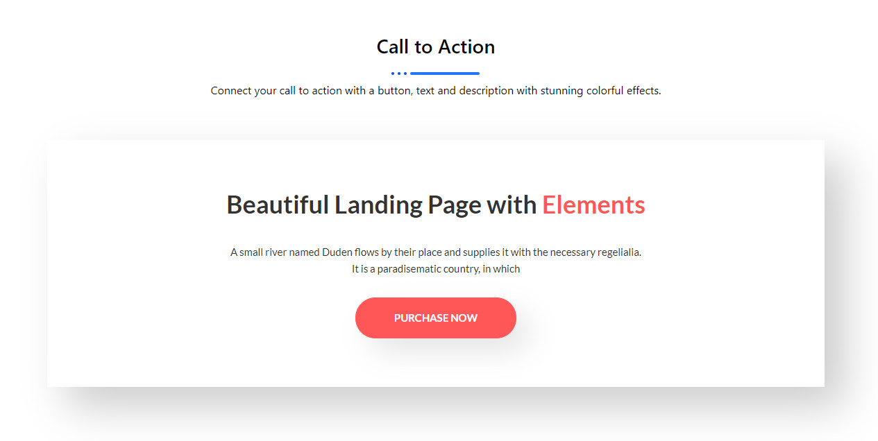 Call to Action Add an eye warming background image and grab more attention from the user. Beautiful Landing Page with Elements A small river named Duden flows by their place and supplies it with the necessary regelialia. It is a paradisematic country, in which Purchase now