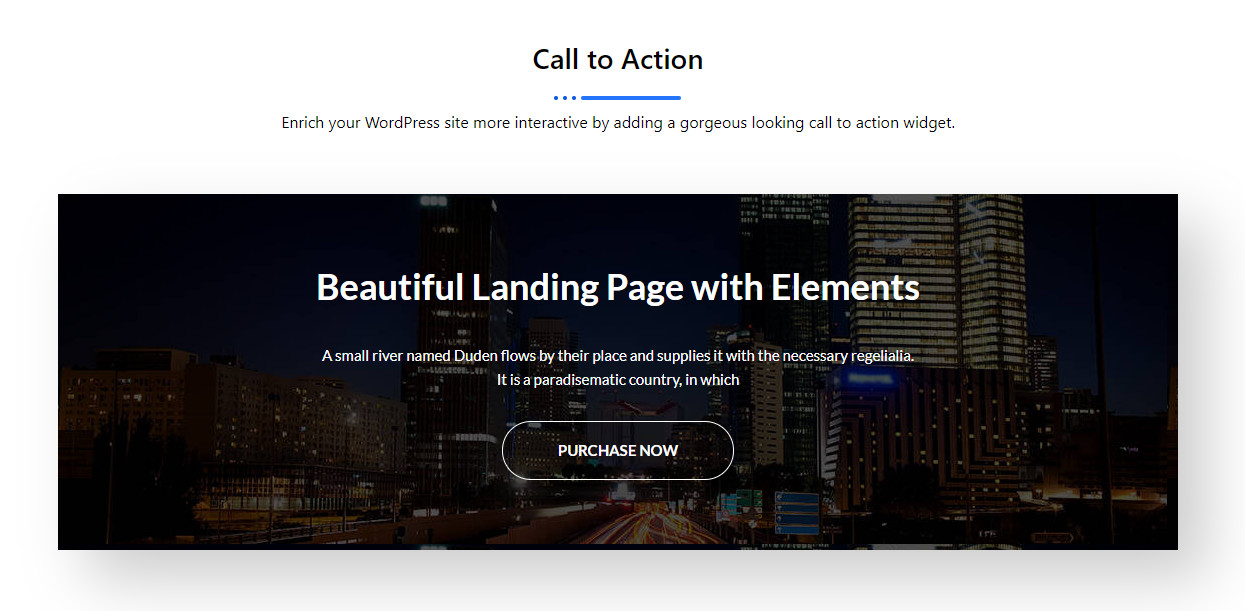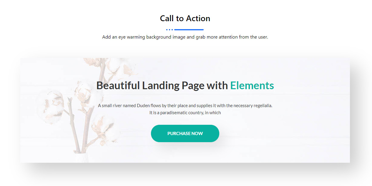 Call to Action Enrich your WordPress site more interactive by adding a gorgeous looking call to action widget. Beautiful Landing Page with Elements A small river named Duden flows by their place and supplies it with the necessary regelialia. It is a paradisematic country, in which Purchase now